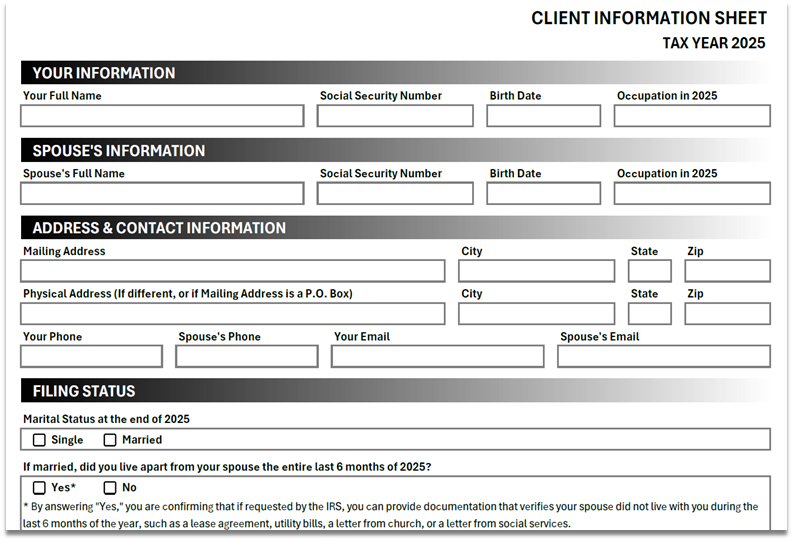I am happy to share with you the exact same Client Information Sheet that I use in my own tax business. I have attempted to make our Client Information Sheet as professional and thorough as possible, while at the same time, streamlined and easy to read and understand.